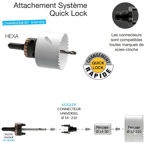 - Pour scies-cloche de 14 à 210 mm de diamètre
