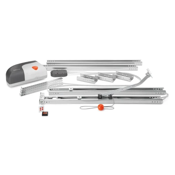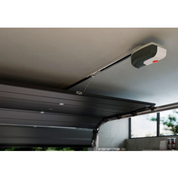 - 1 opérateur 24Vcc de 600 Nm, avec fin de course électronique, détection d’obstacle intégrée, ralentissement en ouverture et fermeture, éclairage de courtoisie, centrale et récepteur incorporés et transmission par courroie sur rail en acier zingué (rail : 3x1m)