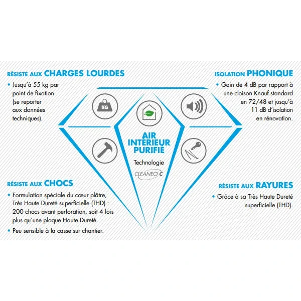 Profitez des nombreuses qualités de la plaque de plâtre Knauf Diamant 13 Cleaneo C en la sélectionnant pour réaliser votre mur intérieur.