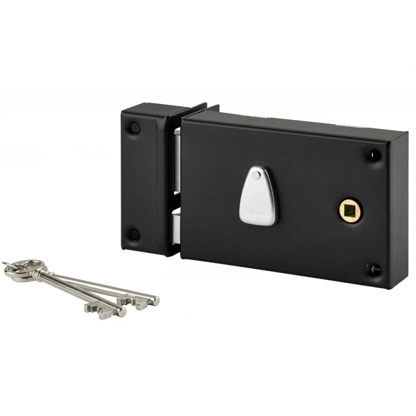 Cette serrure Thirard se pose en applique horizontalement sur une grille ou un portail en extérieur.